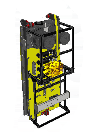 A mechanical robot arm with a black body and yellow hooks at the top, connected to a yellow and black casing with transparent panels revealing gears and mechanical components inside.